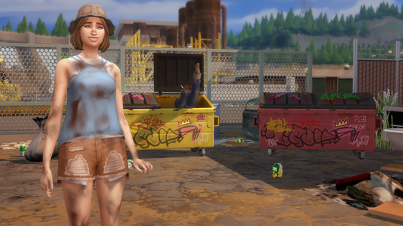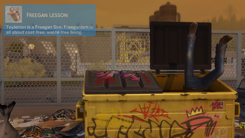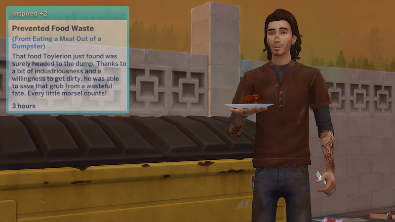 I say hi to the old garbage bin behind Nellie’s Diner and open the lid with a lot of flair. Inside, there’s leftover food from yesterday that looks kind of gross but could still be useful. I’m really good at finding treasures in alleyways without getting hurt. I find a dented frying pan and get excited because it’s still usable. Maybe I can sell it for money or keep it for myself. We’ll see.